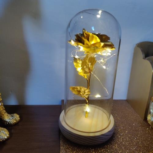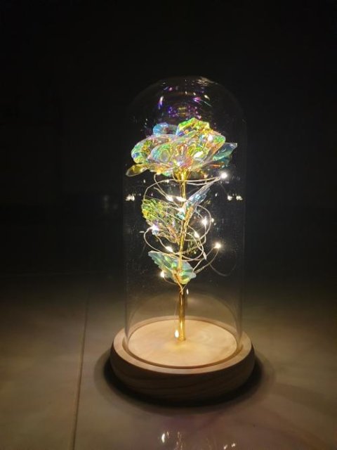 De gouden steel ondersteunt een Roze iris die omringd is door LED-lampjes die een warme en romantische sfeer creëren.